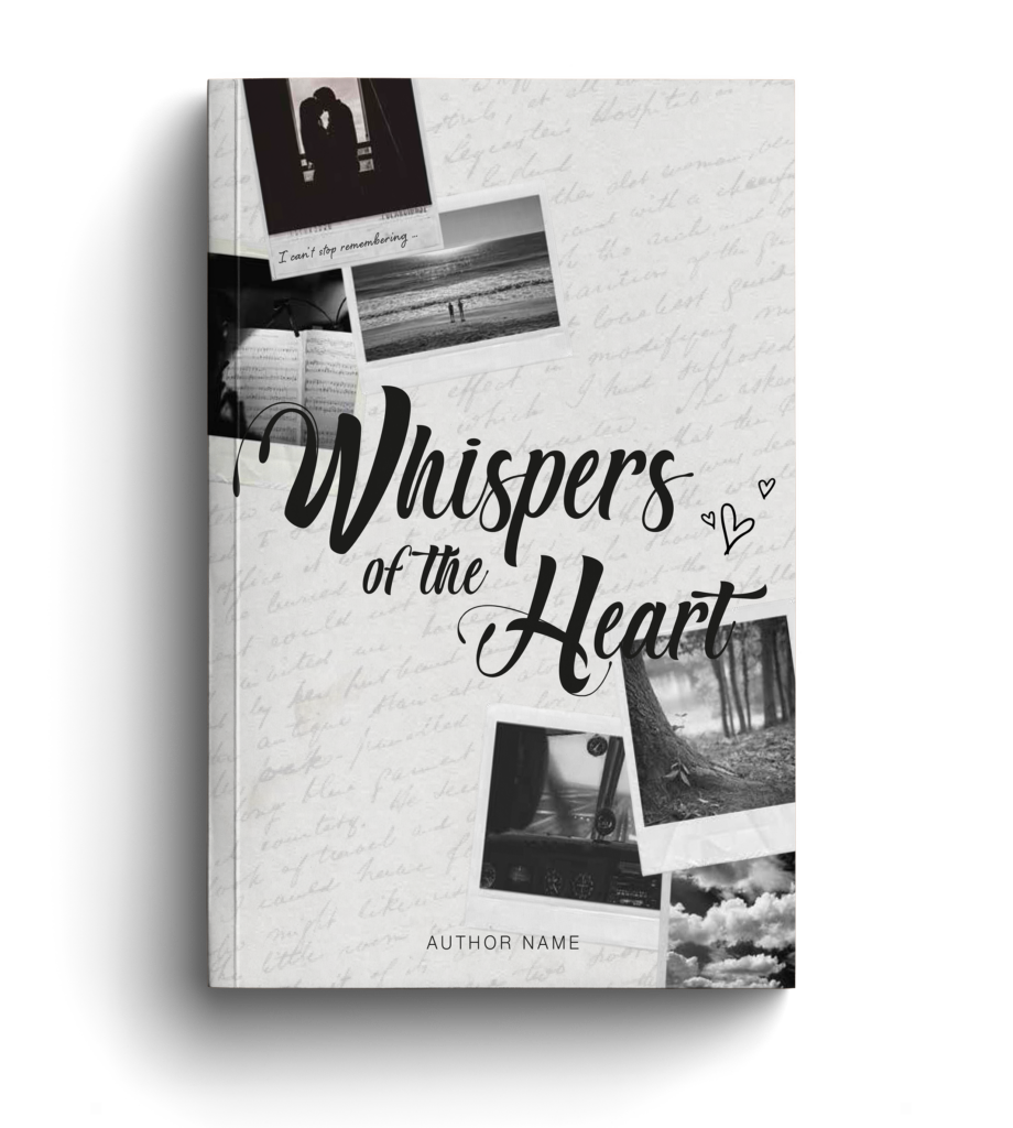Voici une couverture fictive que j’ai créé. L’objectif que je me suis fixée été de créer une couverture qui transmettrait des émotions tel que la nostalgie et la tristesse. Le titre a été choisi dans ce but, il signifie “Les murmures du coeur”. Les différents polaroïds évoquent des souvenirs, les écritures manuscrites aux derniers plans font référence à une correspondance ancienne et les tons noirs et gris font ressortir le côté morose de cette création.