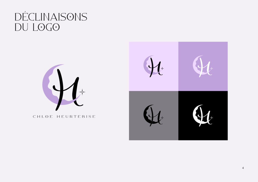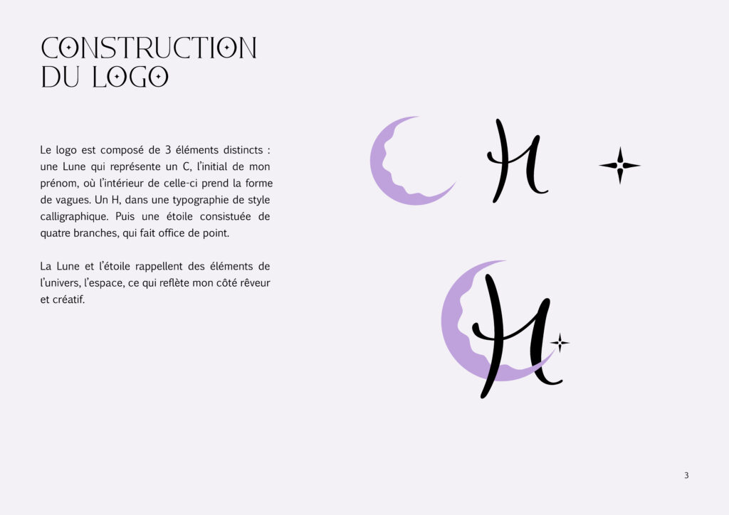 Le logo est composé de trois éléments distincts : une lune, un H et une étoiles à quatre branches. La lune évoque un univers doux et rêveur. Elle symbolise l’imagination, la sensibilité et une affinité avec le cosmos. Elle représente également l’initial de mon prénom. Le H écrit dans une typographie calligraphique donne un aspect élégant et raffiné. Quant à l’étoile, elle fait référence au point en fin de signature (ex : Chloé H.) et accentue le côté céleste et enchanteur.